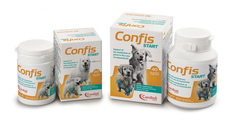 Confis Start è un mangime complementare dietetico destinato a particolari fini nutrizionali per cani adulti e cuccioli, formulato per il supporto del metabolismo articolare in caso di osteoartrite.
